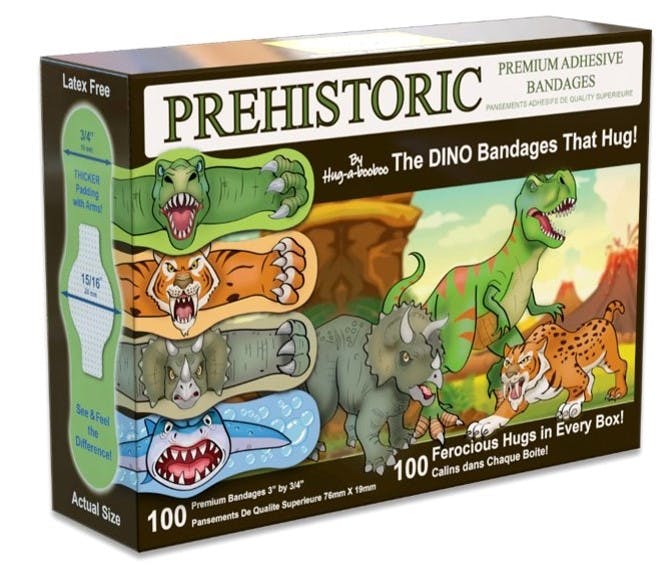 What resulted was a line of kids’ bandages consisting of a variety of cartoon animals, people, dinosaurs and the like with their arms outstretched along each end of the bandage so that when affixed to the wound it looks like the animal is hugging it. Hug-a-BooBoo was born.
