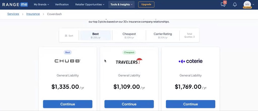 Once the supplier enters the Coverdash experience within RangeMe, they simply answer a few questions related to their business (many of the fields are pre-populated for their convenience) and within minutes Coverdash will return the top three insurance providers that best match their needs. Results can be filtered by “Best,” “Cheapest” or “Carrier Rating.” From there, they simply select the provider of their choice and purchase the insurance.